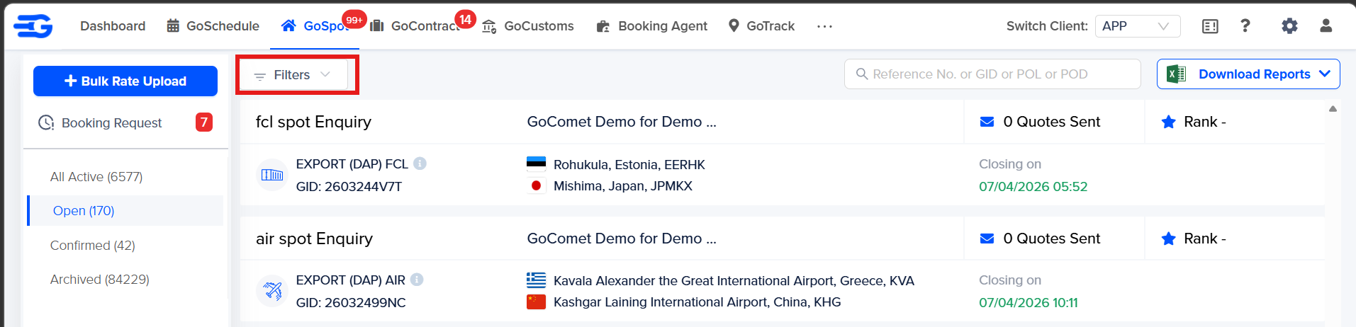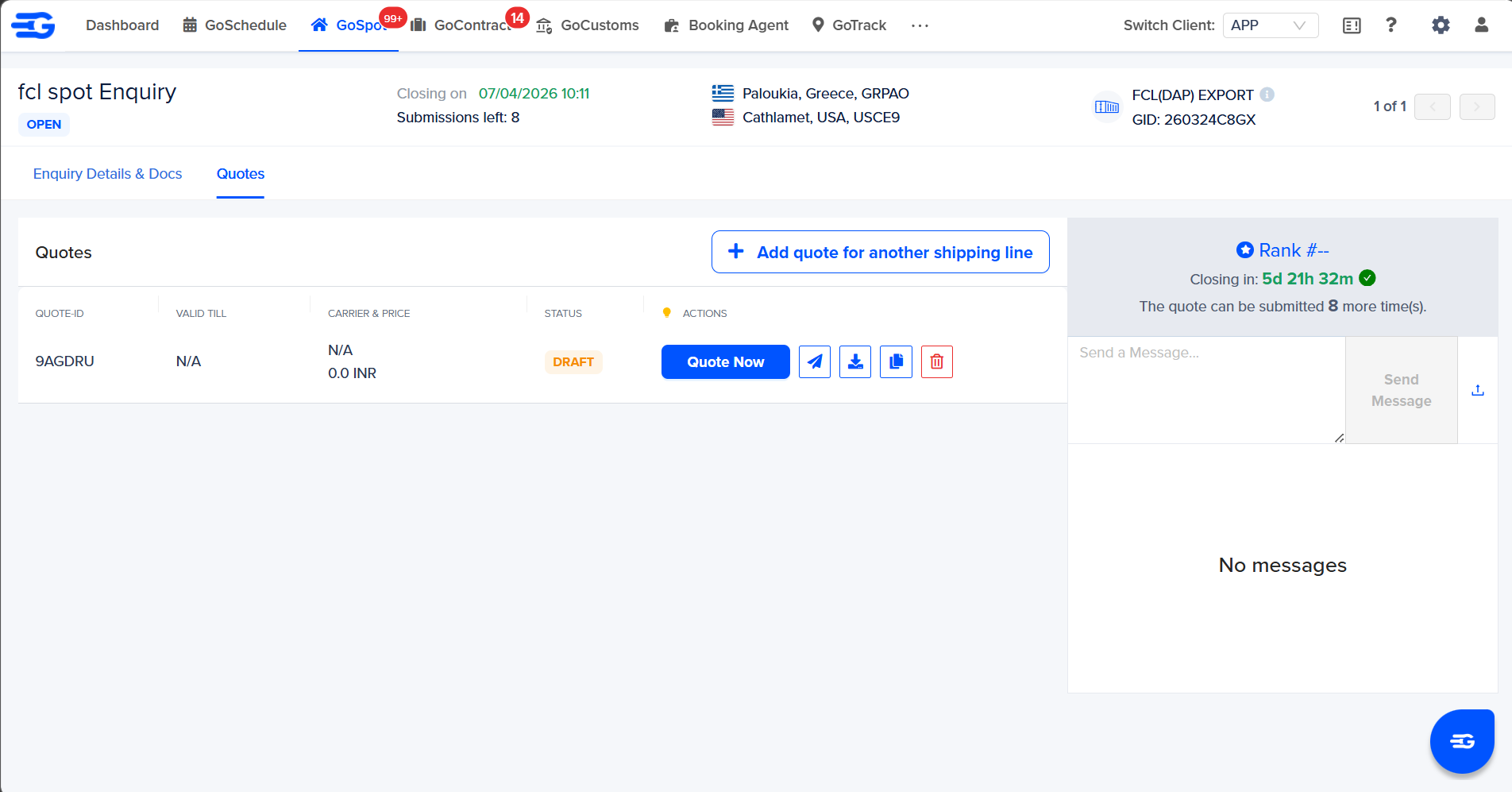 Click on "GoSpot/GoContract" icon in Top Left Corner > Select the Enquiry on which you wish to quote > Click on the enquiry to open > Selected enquiry will open in a new tab > Click on Quote now button to open the quote form.