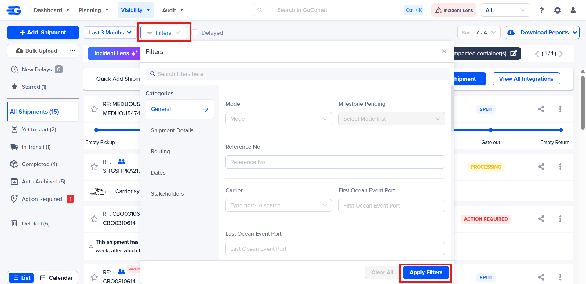 Step 3 - Fill in the details such as origin, destination, carrier, origin region, destination region, mode, Shipments arriving after or before, consignee group, etc. as per your requirements.