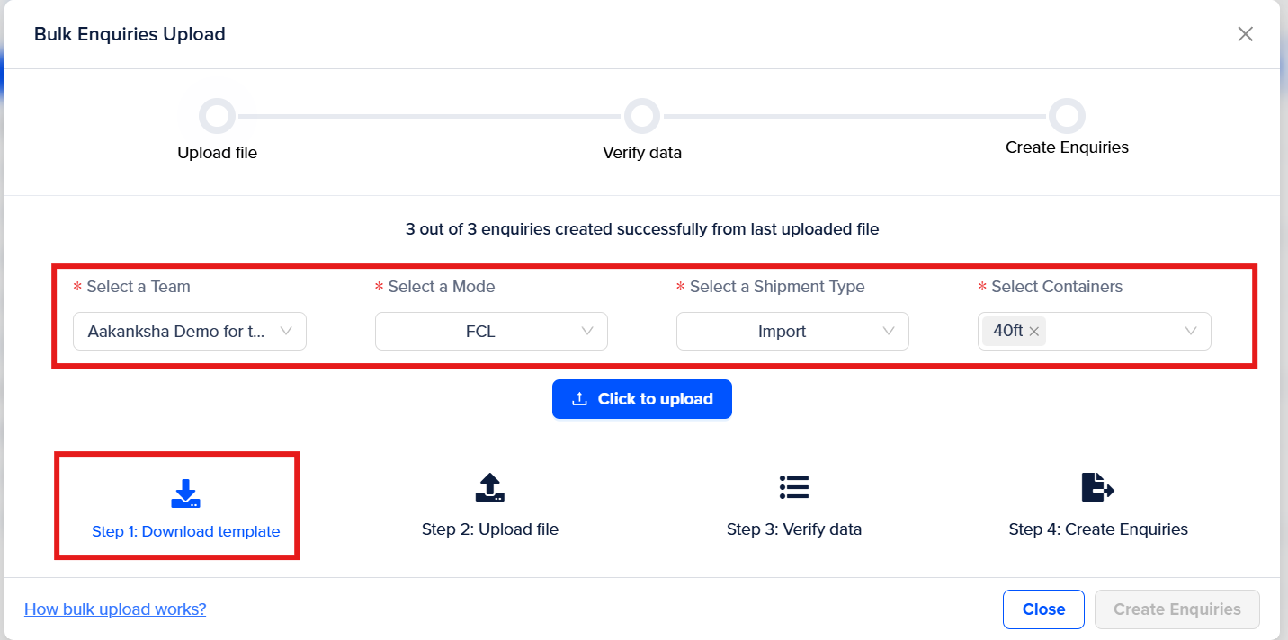 Step 4 – Select the right team, Mode, Shipment Type, etc. to which enquiries are to be uploaded and Click on the "Download template" to download the excel file.