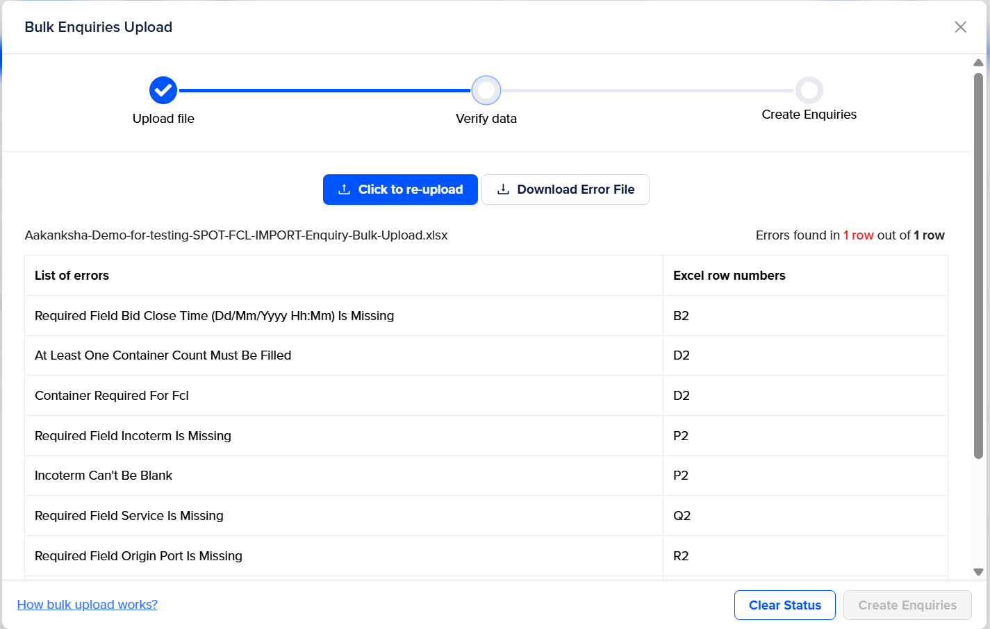 Step 6 – Click on “Create enquiries” once the file which you have uploaded on the platform is error-free.