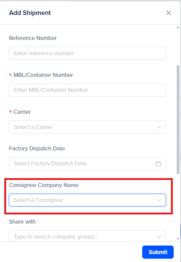 Step 4: Once you add the desired consignee company, click on “Submit”. The Consignee will be notified about the tracking details.